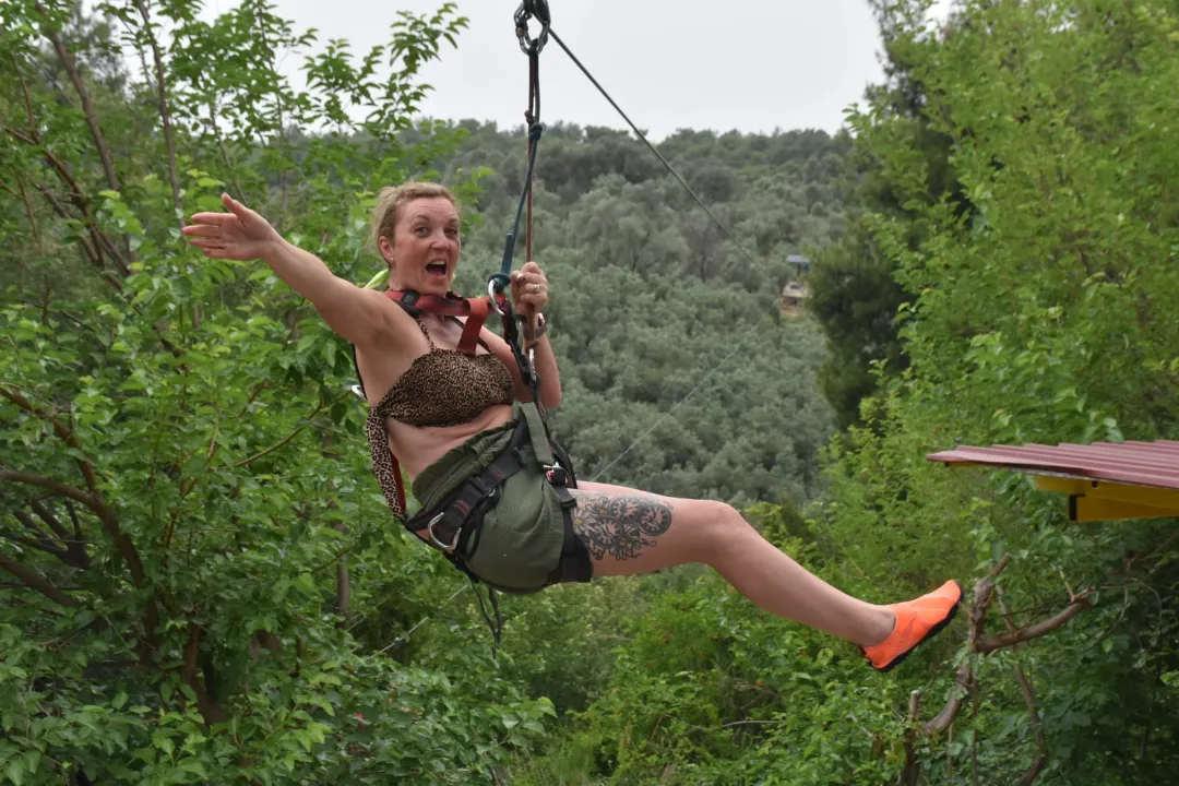 After a short safety briefing, guests are securely attached to the zipline and begin their glide across the canyon. The route consists of two separate lines, allowing participants to enjoy the activity in a safe and controlled environment.